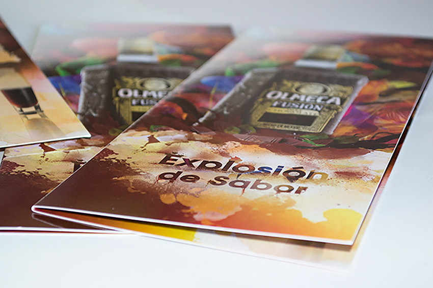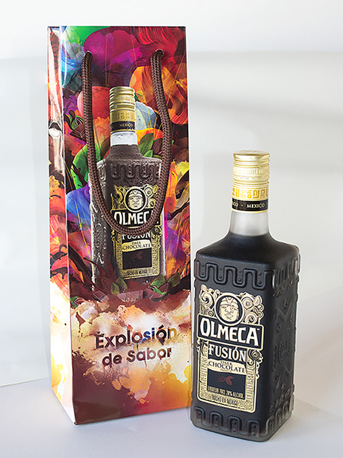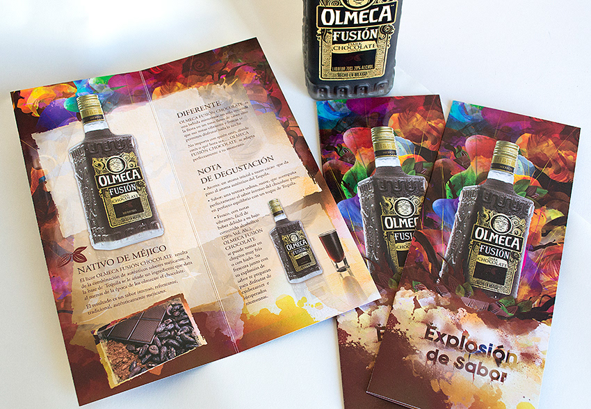 Olmeca Fusión es una bebida mezcla de tequila y chocolate negro. Diseño de welcome pack para presentación del producto: botella y pieza gráfica.
